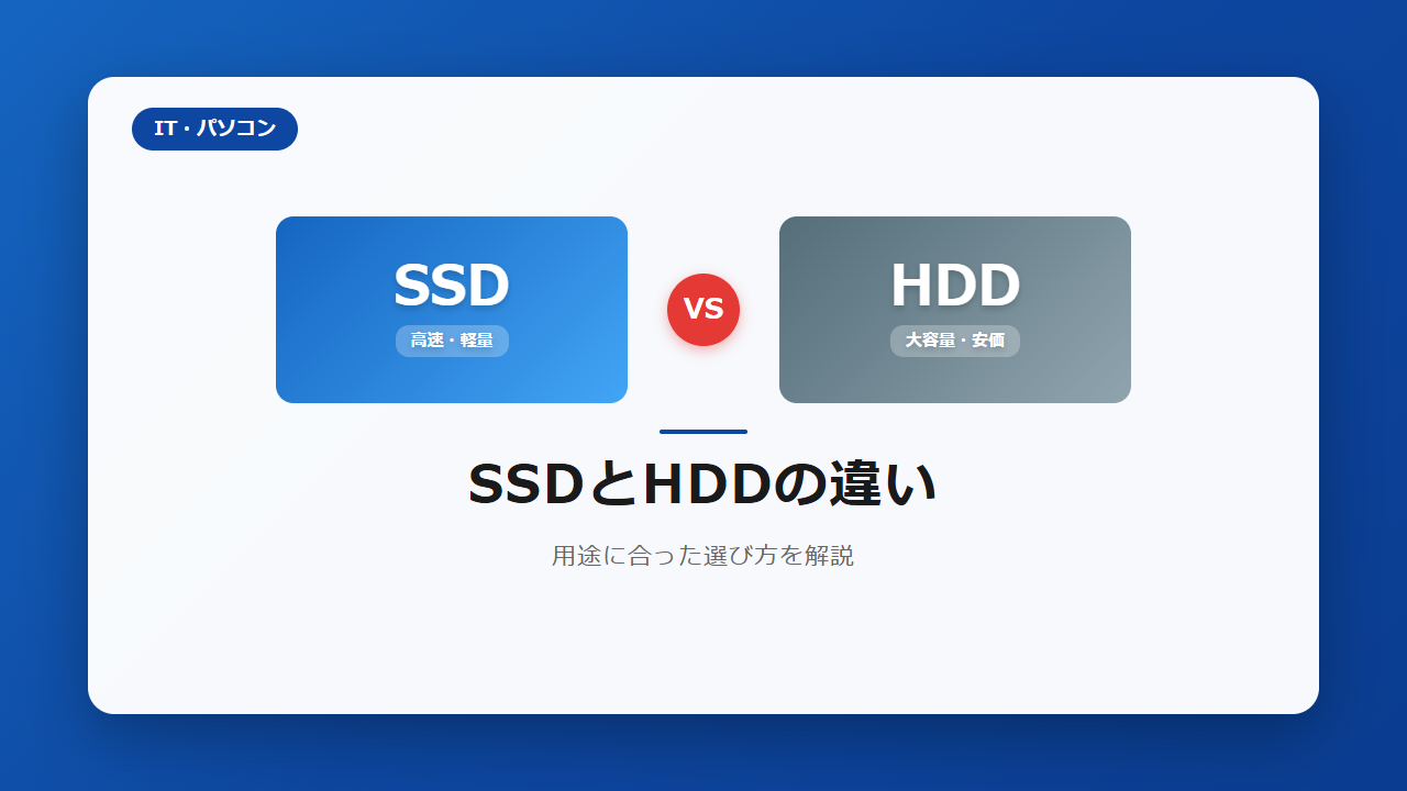 パソコンを買うとき、「SSDとHDDってどっちがいいの?」と迷ったことはありませんか? 最近はSSD搭載のパソコンが主流になりつつありますが、HDDにもまだまだメリットがあります。この記事では、SSDとHDDの違いをわかりやすく比較し、用途に合った選び方を解説します。